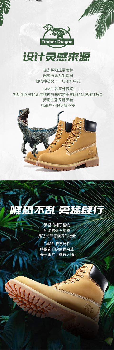 據(jù)了解,這款恐龍鞋的設(shè)計靈感主要是來源于恐龍、雨林、侏羅紀(jì)等野性十足的元素。"想去探險熱帶雨林,想游歷恐龍生態(tài)圈。"駱駝設(shè)計師"夢回侏羅紀(jì)":"勇闖恐龍世界的無畏精神,跟駱駝敢于冒險的品牌理念非常契合。所以我們將恐龍鐫刻于鞋,致敬永不會停下的戶外挑戰(zhàn)精神。"