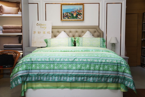 “迦綾”青翠的色調(diào),活性印花讓100支長(zhǎng)絨棉面料給人們一種春天的氣息。