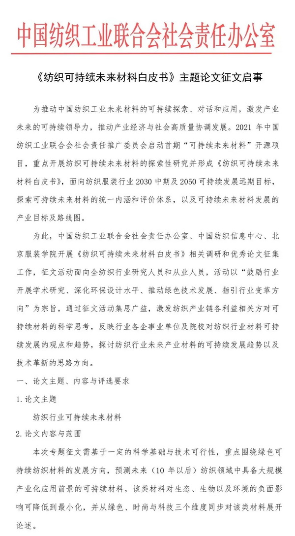 為此,中國紡織工業(yè)聯(lián)合會社會責任辦公室開展《紡織可持續(xù)未來材料白皮書》相關(guān)調(diào)研和優(yōu)秀論文征集工作,征文活動面向全紡織行業(yè)研究人員和從業(yè)人員,活動以“鼓勵行業(yè)開展學術(shù)研究、深化環(huán)保設(shè)計水平、推動綠色技術(shù)發(fā)展、指引行業(yè)變革方向”為宗旨,通過征文活動集思廣益,激發(fā)紡織產(chǎn)業(yè)鏈各利益相關(guān)方對可持續(xù)材料的科學思考,反映行業(yè)各企事業(yè)單位及院校對紡織行業(yè)材料可持續(xù)發(fā)展的觀點和趨勢,探討紡織行業(yè)未來產(chǎn)業(yè)材料的可持續(xù)發(fā)展趨勢以及技術(shù)革新的思路方向。
