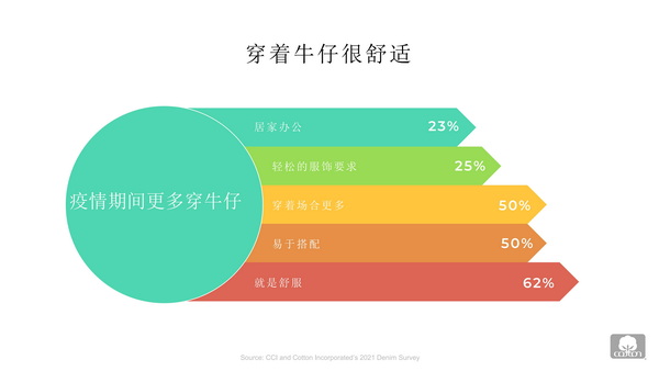 張立綱分析,疫情之后著裝風(fēng)格的最大轉(zhuǎn)變之一是消費(fèi)者偏好轉(zhuǎn)向更舒適、休閑且時(shí)尚的服裝。由于牛仔褲穿著舒適,人們居家辦公經(jīng)常穿著牛仔,并且許多工作場(chǎng)所已經(jīng)放寬或計(jì)劃放寬著裝要求,更助力消費(fèi)者在工作場(chǎng)合穿著牛仔褲。而在工作之外的許多活動(dòng)中,牛仔褲也是中國(guó)消費(fèi)者的熱門(mén)選擇,五分之四的中國(guó)消費(fèi)者表示牛仔褲是他們首選的休閑裝。