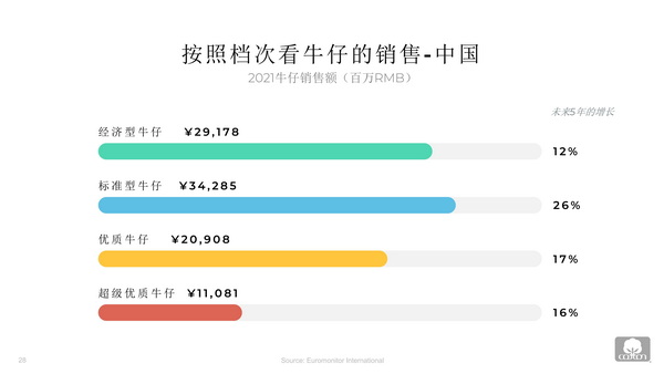 近一半的中國(guó)消費(fèi)者表示,今年他們計(jì)劃購(gòu)買(mǎi)比去年更多的牛仔褲。預(yù)計(jì)到2026年,牛仔褲的銷(xiāo)售額將強(qiáng)勁增長(zhǎng)19%,達(dá)到近1130億元。張立綱指出,按牛仔褲種類(lèi)來(lái)看,經(jīng)濟(jì)型和標(biāo)準(zhǔn)型牛仔褲占中國(guó)牛仔褲銷(xiāo)售額的大部分,占市場(chǎng)的近66%。在未來(lái)五年中,中端價(jià)位標(biāo)準(zhǔn)牛仔褲的增長(zhǎng)最快,緊隨其后的是高檔和超高檔牛仔褲。
