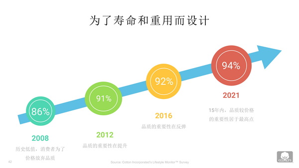 “推動(dòng)服裝質(zhì)量和耐用性將有助于延長(zhǎng)循環(huán)經(jīng)濟(jì)的使用和再使用階段?!睆埩⒕V表示,中國(guó)94%的消費(fèi)者選擇質(zhì)量而不是價(jià)格。消費(fèi)者需要好質(zhì)量,因此設(shè)計(jì)產(chǎn)品需要確保質(zhì)量與耐用性。而中國(guó)近三分之二的消費(fèi)者認(rèn)為,與人造絲、滌綸等其他纖維相比,棉質(zhì)服裝的使用壽命是最長(zhǎng)與最可持續(xù)的。