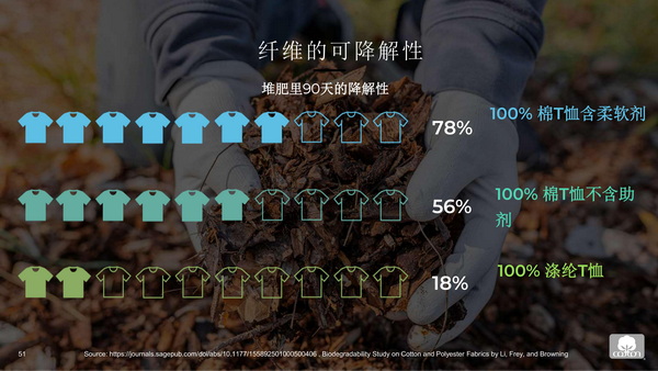循環(huán)的最后一個(gè)支柱是可降解。近四分之三的中國(guó)消費(fèi)者表示,服裝由可生物降解的材料制成很重要。Cotton Incorporated與北卡羅來(lái)納州立大學(xué)合作研究發(fā)現(xiàn),在30天后,棉在廢水中降解了90%以上,在淡水中降解了80%,在鹽水中降解了接近50%,并且在所有這些環(huán)境中能夠完全降解。張立綱強(qiáng)調(diào),作為植物和天然纖維,棉本質(zhì)上是可循環(huán)的。
