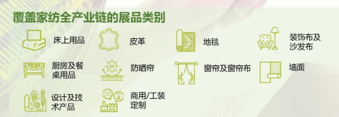 窗簾/窗簾布、遮陽(yáng)簾、裝飾布/沙發(fā)布、毛毯/被子/枕頭/件套等床上用品紡織、毛巾/浴袍等浴室用紡織品、桌布/臺(tái)布等廚房及餐桌用紡織品、地毯、墻布、皮革、鋪地材料、紡織飾品及配件等;