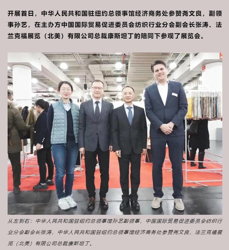美國東部時間2023年1月31日上午10點,由中國紡織工業(yè)聯(lián)合會主辦,中國國際貿易促進委員會紡織行業(yè)分會與法蘭克福展覽(北美)有限公司共同承辦的第二十四屆中國紡織品服裝貿易展覽會(紐約)China Textile and Apparel Trade Show (New York)暨紐約服裝面料展(TEXWORLD)、紐約國際服裝采購展(APPAREL SOURCING)(以下簡稱“紐約展”)在紐約曼哈頓賈維茨展覽中心拉開帷幕。作為“開年第一展,海外第一站”,本屆紐約展及時響應、高效啟動,全面助力紡織服裝企業(yè)在2023年起步快跑,收獲海外商貿“開門紅”。