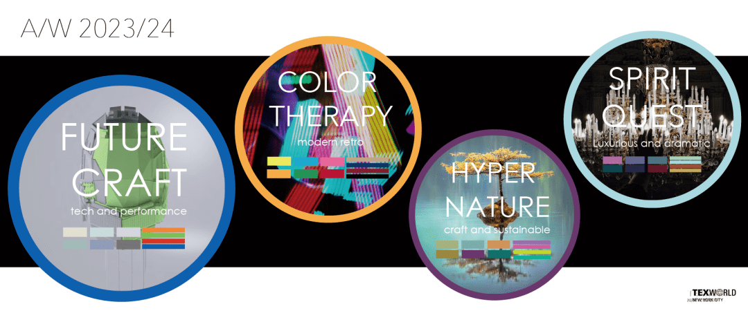 本屆紐約展現(xiàn)場開設趨勢靜態(tài)展示區(qū),引導企業(yè)把握最新時尚脈絡,本屆展會現(xiàn)場還展出了2023至24秋冬色彩及面料趨勢趨勢,囊括“Future craft”、“Color therapy”、“Hyper nature”和“Spirit quest”四大主題,方便到場的展商及觀眾了解。