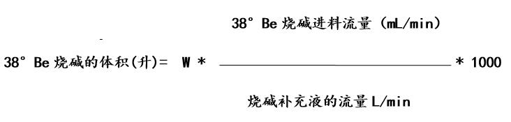 根據(jù)此燒堿補(bǔ)充液總量的計(jì)算值,適當(dāng)可多配制些補(bǔ)充液,假定此燒堿補(bǔ)充液的總量為W升,則如下計(jì)算配制此補(bǔ)充液所需38°Be燒堿的體積。