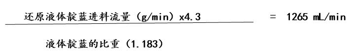 此部分扣除的燒堿等于本廠靛藍(lán)的進(jìn)料流量(g/min)x4.3x6.03%;另外,1mL的38°Be的燒堿溶液中含有0.44g固體燒堿,所以折算成38°Be的燒堿溶液的體積數(shù)為本廠靛藍(lán)的進(jìn)料流量g/min)x4.3x6.03%x0.44,即本廠靛藍(lán)的進(jìn)料流量(g/min)x4.3x6.03%x2.27.