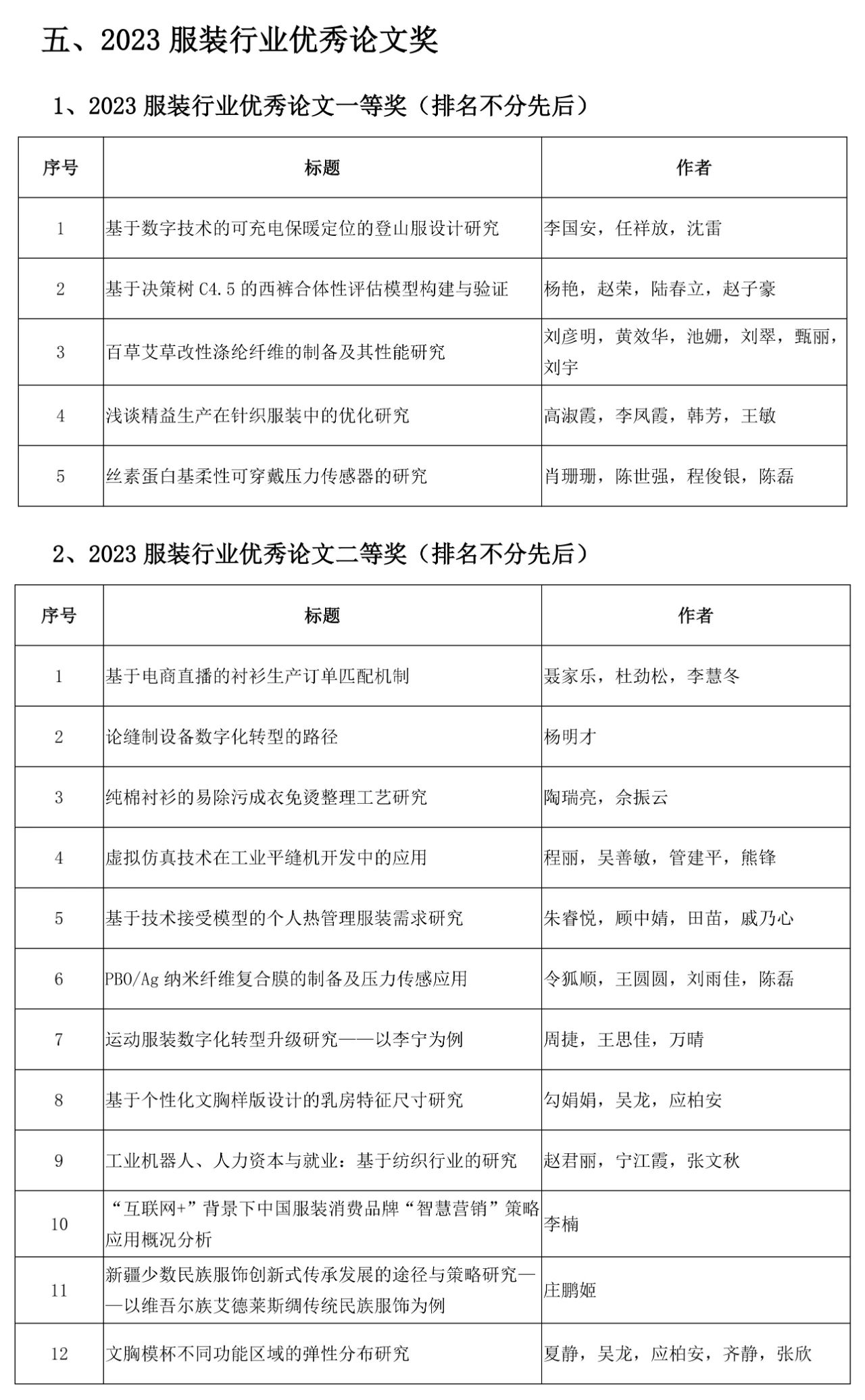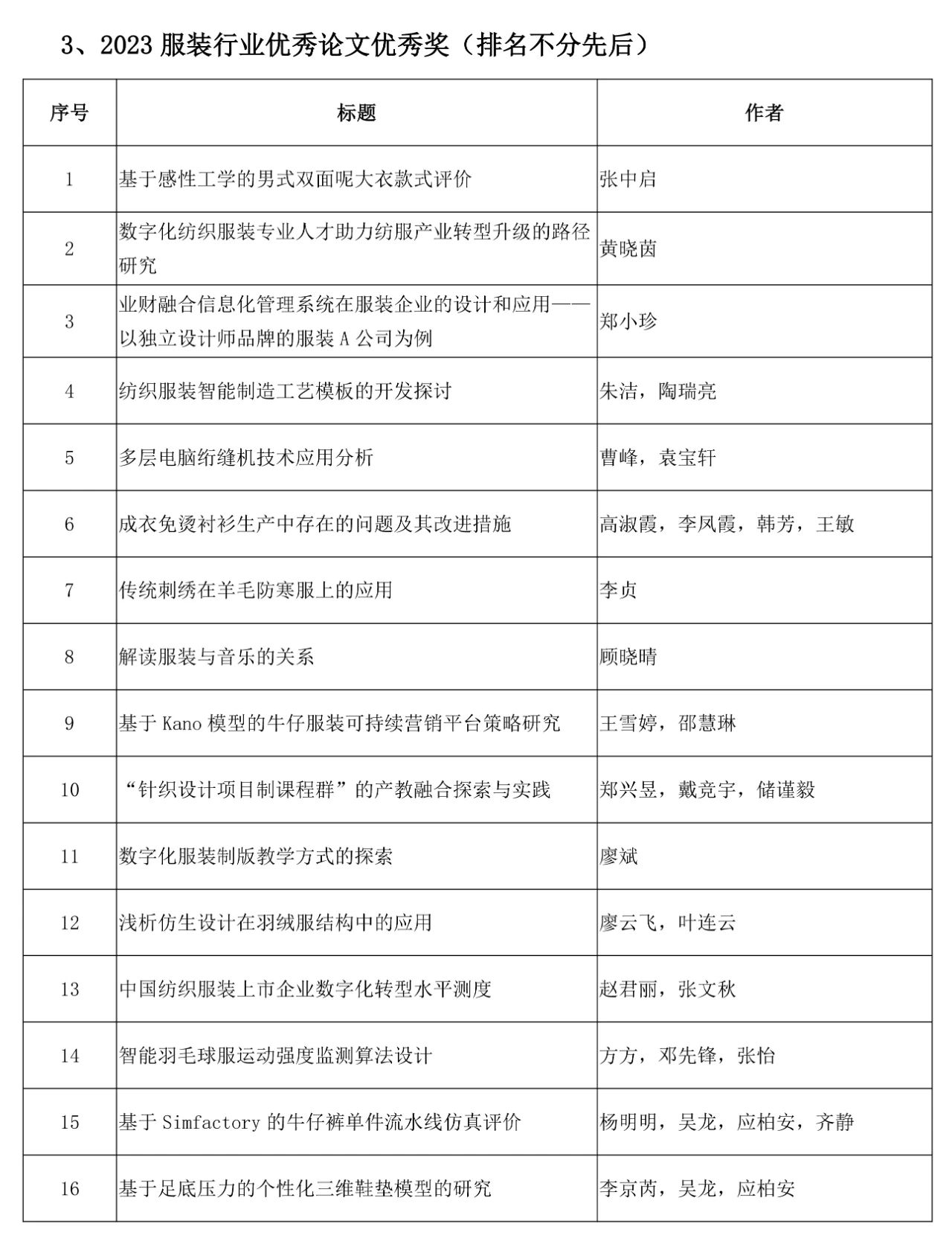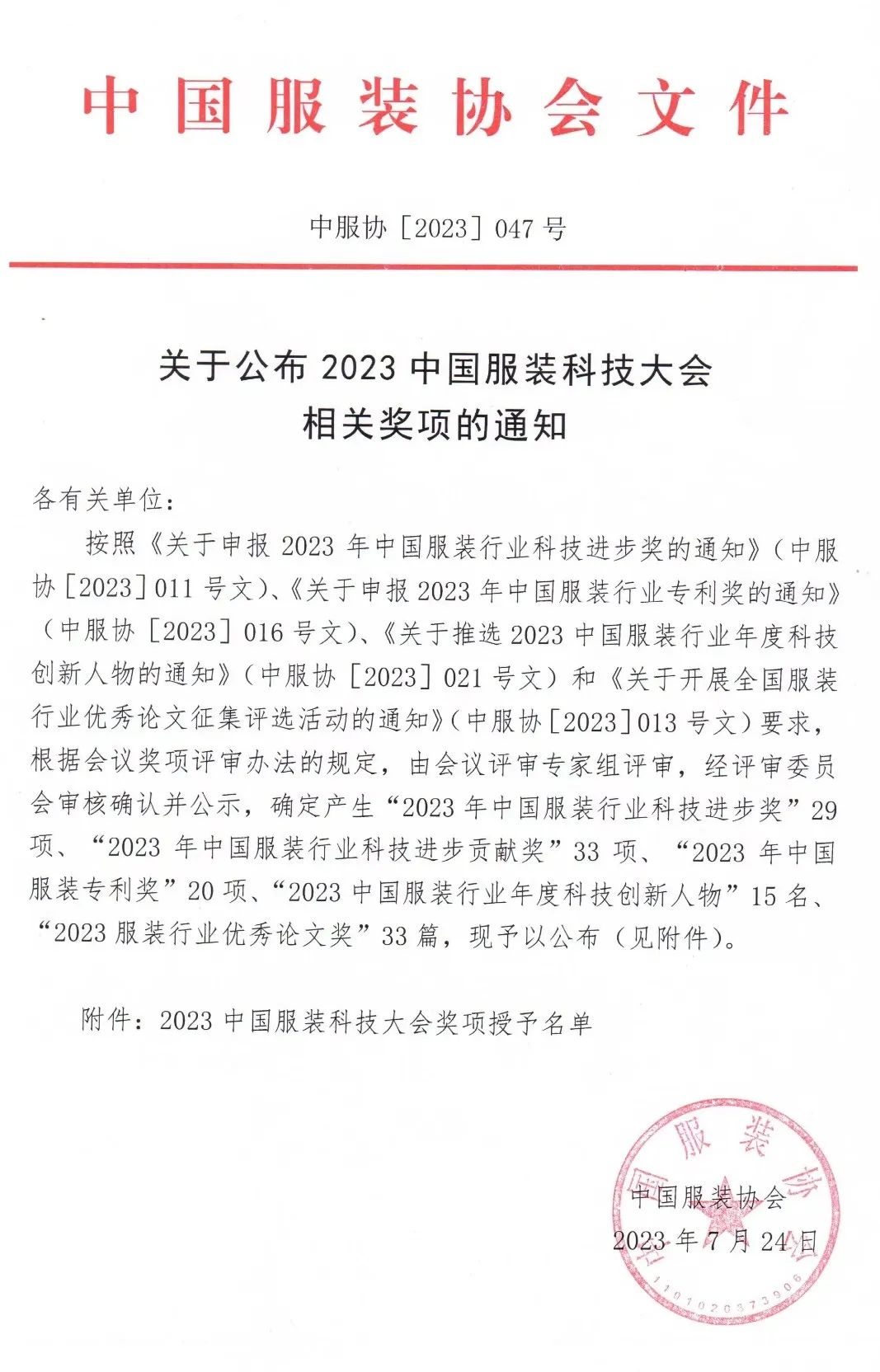 相關(guān)獎(jiǎng)項(xiàng)征集工作收到全行業(yè)的積極響應(yīng)。根據(jù)會(huì)議獎(jiǎng)項(xiàng)評(píng)審辦法的規(guī)定,由會(huì)議評(píng)審專家組評(píng)審,經(jīng)評(píng)審委員會(huì)審核確認(rèn)并公示,確定產(chǎn)生“2023年中國(guó)服裝行業(yè)科技進(jìn)步獎(jiǎng)”29項(xiàng)、“2023年中國(guó)服裝行業(yè)科技進(jìn)步貢獻(xiàn)獎(jiǎng)”33項(xiàng)、“2023年中國(guó)服裝專利獎(jiǎng)”20項(xiàng)“2023 “2023服裝行業(yè)優(yōu)秀論文獎(jiǎng)”33篇和中國(guó)服裝行業(yè)年度科技創(chuàng)新人物”15名。