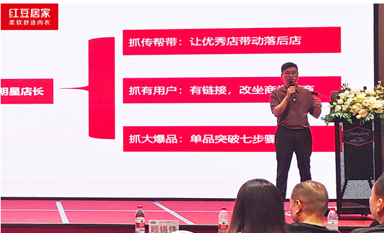 紅豆居家連鎖總監(jiān)顧錫鋒提出了快速開店,規(guī)模增效;智慧零售,線下創(chuàng)效;聚焦爆品,品類提效;人才專業(yè),團(tuán)隊(duì)高效四大戰(zhàn)略舉措,并立下武漢區(qū)域2024年度目標(biāo):全線進(jìn)駐重點(diǎn)城市購(gòu)物中心,打造武漢百店工程,成為武漢區(qū)域居家內(nèi)穿行業(yè)領(lǐng)先品牌。