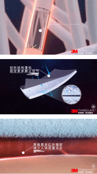 與傳統(tǒng)保暖材料相比,3M™新雪麗™系列產(chǎn)品具有優(yōu)良的保暖特性,憑借其黃金三角保暖結(jié)構(gòu),即導(dǎo)熱率低、結(jié)構(gòu)蓬松以及屏蔽人體輻射,實現(xiàn)優(yōu)異的保暖性能,在防寒產(chǎn)品上逐漸取代了傳統(tǒng)保暖材料,并廣泛被世界各大知名品牌運用。