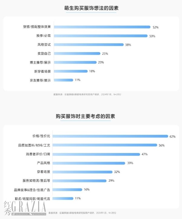 在“精算”消費(fèi)的背景下,與消費(fèi)升級(jí)并行的還有理性的消費(fèi)態(tài)度。盡管和諧的穿搭效果是激發(fā)消費(fèi)者購(gòu)買欲望的關(guān)鍵,但仍有半數(shù)消費(fèi)者是因季節(jié)性更換和基本需求等剛性因素而下單購(gòu)買。每位消費(fèi)者化身“精算師”,服飾的性價(jià)比成為用戶下單的核心考量。