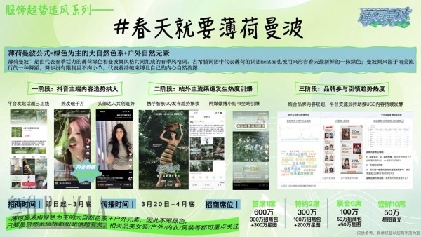 最后,重磅推出造風(fēng)IP,構(gòu)建營(yíng)銷新場(chǎng)景,讓品牌提前對(duì)話趨勢(shì)獲得新切口。在春日的清新氣息中,“薄荷”代表最生動(dòng)的綠意。抖音電商基于“薄荷曼波”這一風(fēng)格趨勢(shì),打造出最新內(nèi)容營(yíng)銷IP,通過(guò)季節(jié)特性、用戶偏好與產(chǎn)品風(fēng)格的有機(jī)結(jié)合,拓展消費(fèi)場(chǎng)景多樣性,助力不同類別品牌成就生意新增長(zhǎng)。