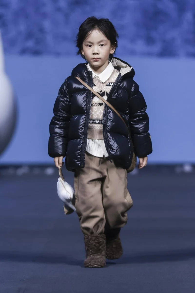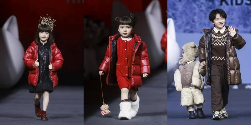 小模特動(dòng)線與系列風(fēng)格深度綁定:黑金寶貝小童系列模特如翻花般沿秀道兩側(cè)行進(jìn)至臺(tái)前定點(diǎn);奪冠運(yùn)動(dòng)系列采用 U 型動(dòng)線,U 型秀道的光勾勒出利落線條。頭腰部達(dá)人矩陣更是引爆現(xiàn)場(chǎng):超頭達(dá)人沐言開心醬身著黑金寶貝精靈帽鵝絨服開場(chǎng),同款服飾直播期間涌入千條預(yù)約訂單;一顆肉丸子以黑金寶貝北歐熊寶鵝絨服登場(chǎng),可愛萌趣引發(fā)熱議。