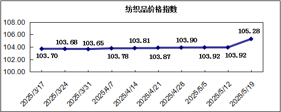“中國·柯橋紡織指數(shù)” 20250519期紡織品價格指數(shù)收報于105.28點(diǎn),環(huán)比上漲1.31%,較年初上漲0.71%,去年同比上漲0.04%。