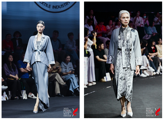 作為“現(xiàn)代漢民族民族服”的核心載體,本次大秀系統(tǒng)呈現(xiàn)四大著裝標(biāo)準(zhǔn),完成從禮儀服飾到生活方式的文化轉(zhuǎn)譯。秀場(chǎng)內(nèi),燈光聚焦在T臺(tái)中央,如夢(mèng)如幻。隨著音樂響起,模特們身著商務(wù)正裝系列緩緩登場(chǎng)。碳灰、中灰、珍珠灰等專業(yè)灰色系服飾,在模特們自信的步履間,傳遞出專業(yè)穩(wěn)重的氣質(zhì)。立領(lǐng)、對(duì)襟等傳統(tǒng)細(xì)節(jié)與優(yōu)化后的肩部剪裁、修身版型相得益彰,經(jīng)典與現(xiàn)代審美完美融合,贏得現(xiàn)場(chǎng)陣陣贊嘆。