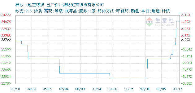 08月05日濰坊冠杰紡織有限公司關于棉紗21S的報價為23000元/噸。棉紗21S的規(guī)格:紗支:21S;紗質(zhì):高配;等級:優(yōu)等品;股數(shù):1股;紡紗方法:環(huán)錠紡;顏色:本白;用途:針織。該報價有效期為3天。報價提供方:濰坊冠杰紡織有限公司。