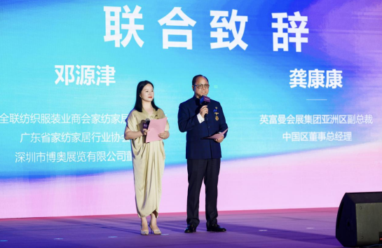核心致辭環(huán)節(jié),各界重量級嘉賓依次上臺,為行業(yè)發(fā)展建言獻策。廣東省家紡家居行業(yè)協(xié)會會長、深圳市博奧展覽有限公司董事長鄧源津與英富曼會展集團亞洲副總裁兼中國董事總經(jīng)理龔康康率先作聯(lián)合開場致辭。鄧源津深情回顧了協(xié)會與展會三十年風(fēng)雨同舟的奮斗歷程,強調(diào)三十周年是里程碑更是新起點,協(xié)會未來將繼續(xù)堅定不移陪伴行業(yè)、服務(wù)企業(yè),精準響應(yīng)省委省政府“幫助企業(yè)開拓市場”的號召,將深圳家紡家居展打造成更高效、更開放的全球貿(mào)易樞紐,并鄭重預(yù)告協(xié)會將從2026年起啟動海外辦展計劃,帶領(lǐng)中國企業(yè)積極擁抱全球市場。龔康康高度肯定協(xié)會三十年來推動行業(yè)發(fā)展的豐碩成果,指出國際化是深圳展乃至中國家紡家居產(chǎn)業(yè)未來發(fā)展的核心引擎,英富曼將依托全球網(wǎng)絡(luò)優(yōu)勢,助力展會引進更多國際頂尖品牌與買家,讓深圳成為連接中國與世界的家居貿(mào)易與創(chuàng)意中心。