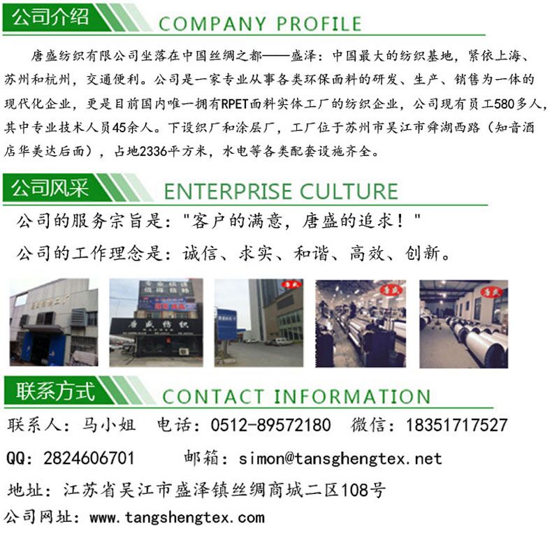 后整理:染色、印花、三防(防水,防污,防油)、壓花、壓皺、涂金/銀/白、防紫外線、阻燃、PU、PVC壓延(新老歐標)、TPE背膠、TPU復合、優(yōu)力膠等