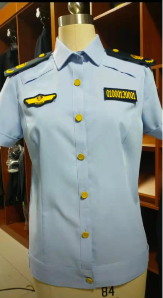 服裝的顏色為藏青色及天空藍(lán)色,搭配金色標(biāo)志。服裝功能主要考慮適應(yīng)城市管理工作場(chǎng)所多在戶外、街頭的實(shí)際,便于執(zhí)勤活動(dòng)