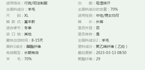 水政監(jiān)察服裝 冬常服面料(藍青色) 成分:羊毛:70%、聚酯纖維:30%、 平方米質量:210g/㎡ 密度:經(jīng):492根/10cm、緯:356根/10cm 面料、翻領面、領座面、掛面、大袋牙、袋蓋、手巾袋墊布、褲后袋口墊布、肩袢、褲門襟、掩襟、褲袢 里料(聚酯纖維) 成份:聚酯纖維:99% 超細纖維另一種合成材料,